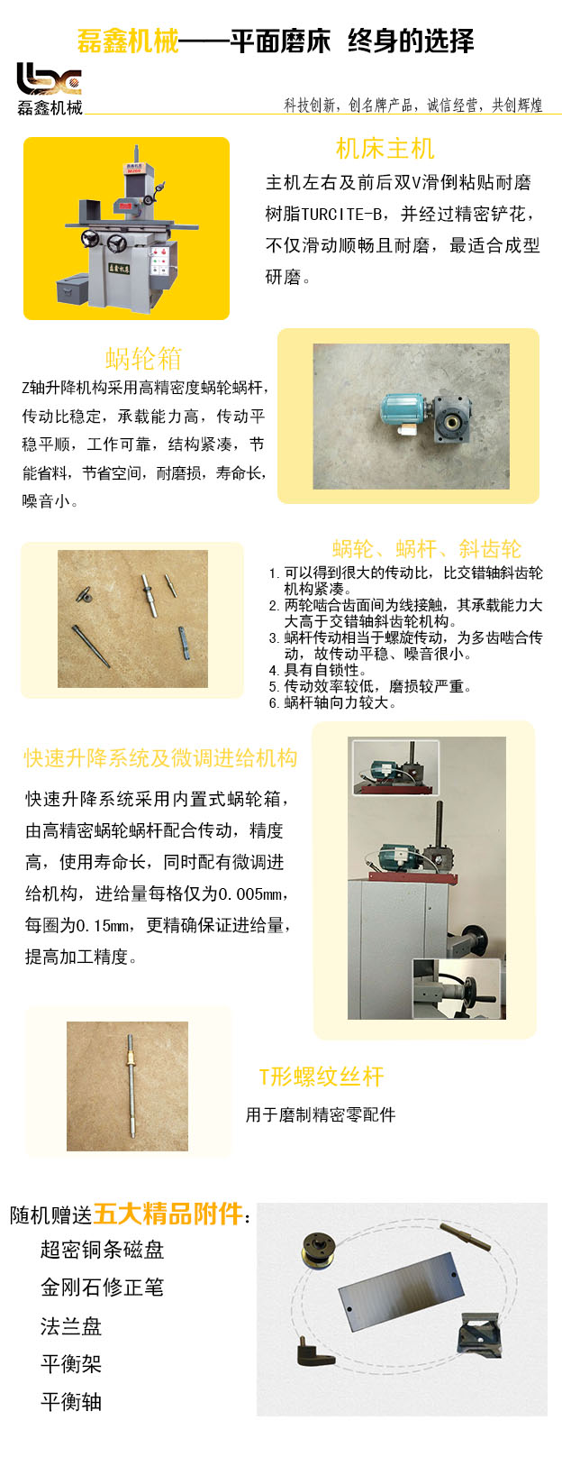 本机床磨头配有快速升降机构及微调装置,可磨削各种平面和复杂成型面,适用于不需要机动进刀的磨削加工,主轴采用P4级精密滚动轴承、迷宫密封,防水防尘性能好,运动平稳、精度高。纵向采用滚珠钢导轨,操作轻便灵活,立柱采用大跨距形导轨,钢性好,稳定性高。整机采用手动油泵集中润滑。